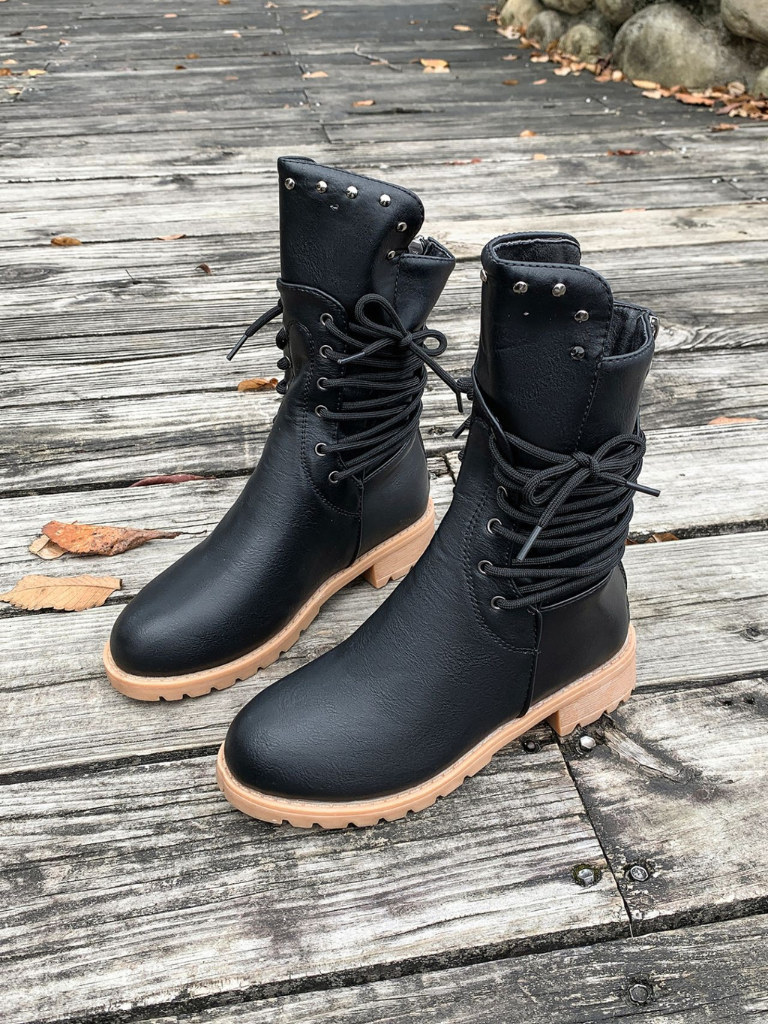 Schritte mit Selbstbewusstsein in den Harper Studded Lace-Up Boots — einem mutigen, aber vielseitigen Paar, das Sie mühelos durch den Herbst und Winter begleitet. Aus PU-Leder gefertigt, kombinieren diese Stiefel Komfort und Langlebigkeit mit einem schicken Nieten-Detail, das genau die richtige Portion Kante verleiht.